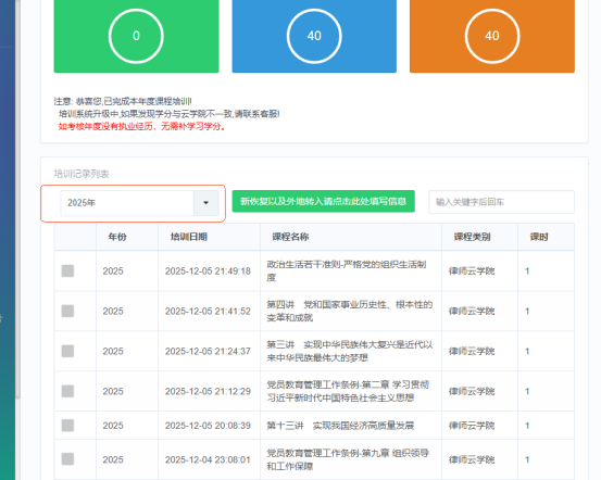 找到培训记录模块,在模块右上角年份筛选栏中手动选择考核查询年份(系统默认可能显示其他年份,需手动切换),如需要查询2025年度培训请选择2025年度即可查看2025年度培训学时完成进度。