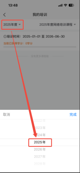 点击页面中的我的培训,在弹出的年份列表中选择2025年度;