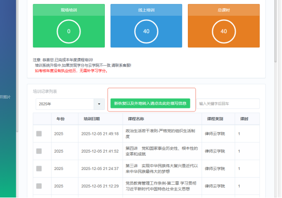 特别提醒:未完成2025年度学时的律师,请通过线上途径补修。本会不再受理该年度线下补训申请(2025自然年度内已完成的线下培训有效)。