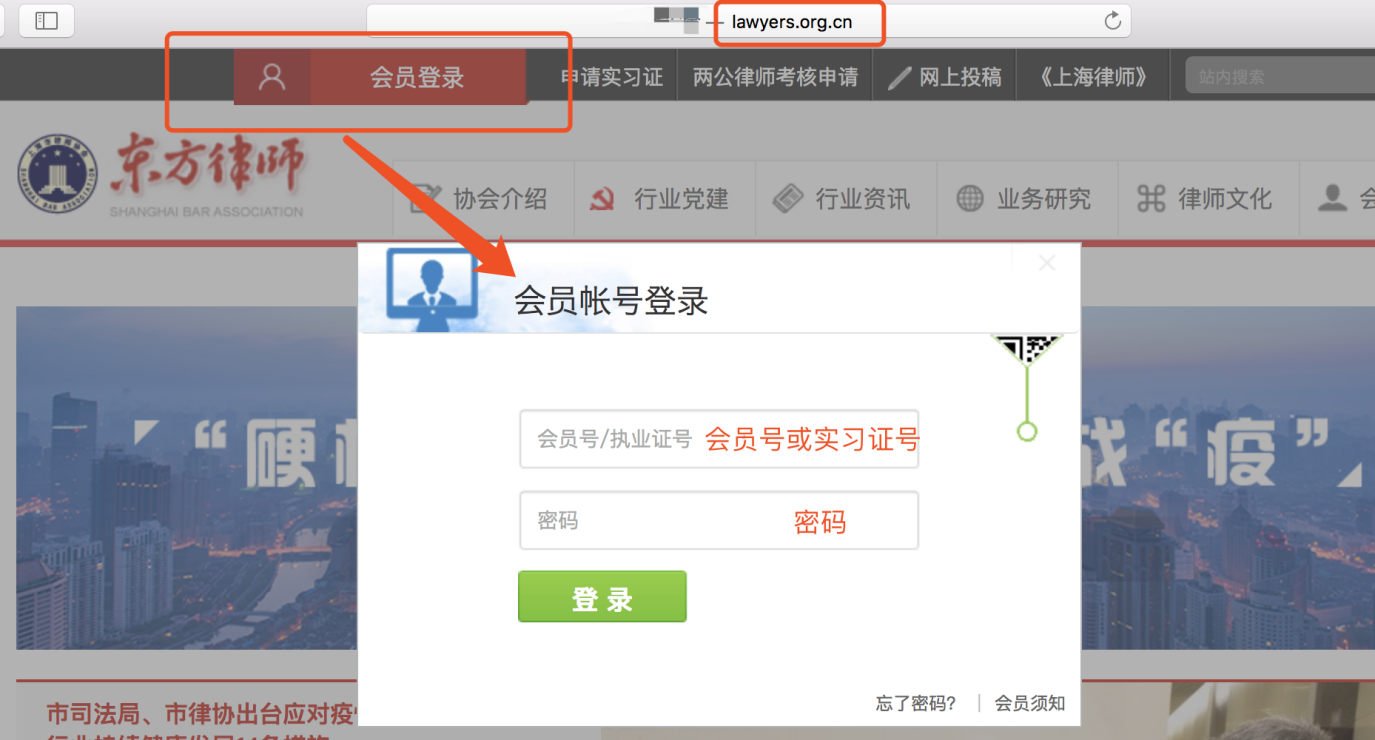 (一)打开东方律师网,点击会员登录,使用实习证号和密码登录后进入会员中心,点击报名缴费: