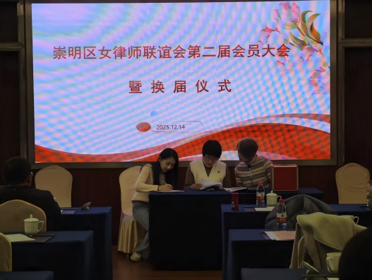 2025年12月14日下午,第二届上海市崇明区女律师联谊会换届选举大会在上海怡沁园顺利召开。区司法局律工科科长周黎明、区律工委主任丁美红、律工委副主任黄赛及全区女律师代表参会。