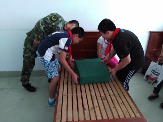 随后,在中队指导员的带领下,众人一齐参观了武警官兵们的宿舍、学习室、荣誉陈列室及装备室等,整齐的内务和众多的荣誉奖章、奖状让小朋友们都叹为观止。此外,在部分武警官兵的讲解与指导下,小朋友们还亲自进行了内务整理并近距离接触了部分装备器材,体验了一把军人及军营生活。