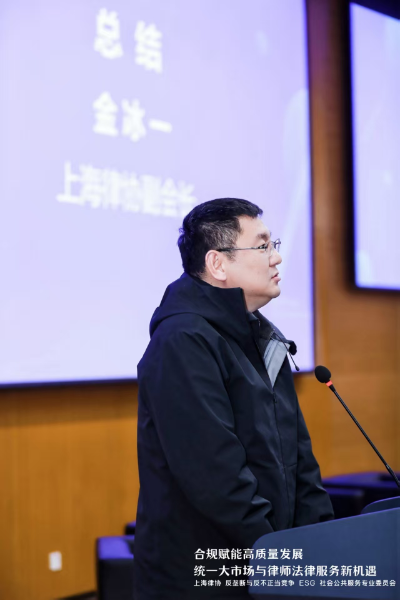 会议最后,由上海律协副会长金冰一致辞总结,金冰一会长强调了在全国统一大市场建设与企业全球化合规经营的双重背景下,律师应主动提升专业能力、拓展服务边界,积极融入国家发展大局,以高水平法律服务赋能经济社会高质量发展。