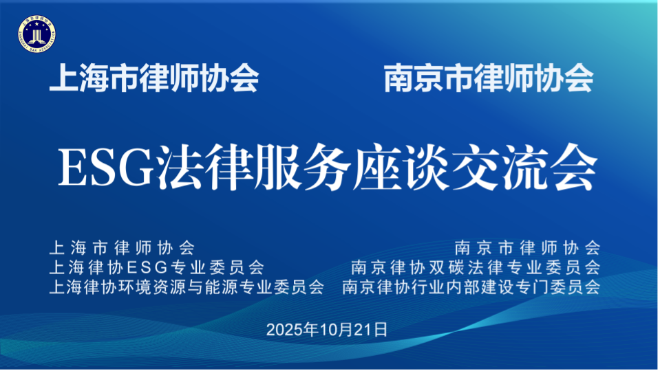 10月21日下午,上海市律师协会(以下简称“上海律协”)与南京市律师协会(以下简称“南京律协”)在上海律协小报告厅联合召开ESG法律服务座谈交流会。南京律协一行专程赴沪调研,沪宁两地律师协会相关负责人及业务骨干共20余人参会,围绕ESG业务发展、业务指引编撰、跨区域协作与品牌建设等议题展开深度对话,共探跨区域协作新方向。