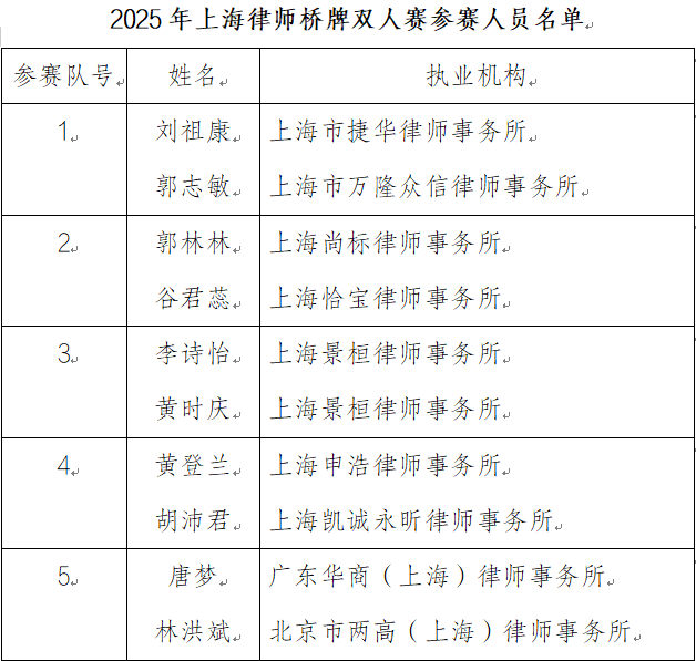 三、参赛人员名单:已通过2025年10月27日《2025年上海律师桥牌双人赛报名通知》报名,参赛名单详见下方“2025年上海律师桥牌双人赛参赛人员名单”。