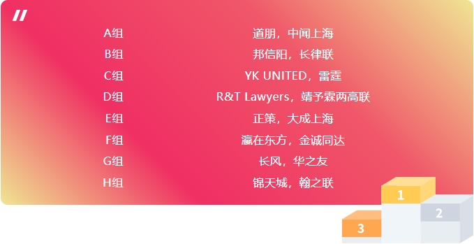 H组小组赛战罢,锦天城2战全胜小组第一,翰之联1胜1负小组第二,隆安2战皆负小组第三,锦天城、翰之联携手出线。