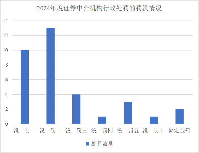 2024年的案例中,对中介机构作出没一罚一处罚的案例有10起,作出没一罚二处罚的案例有13起,作出没一罚三处罚的案例有4起,作出没一罚四处罚的案例有1起,作出没一罚五处罚的案例有3起,作出没一罚十处罚的案例有1起,作出固定金额罚款的案例有2起。2019年《证券法》将中介机构业务收入罚没倍数从1-5倍提高至1-10倍,大幅提高中介机构行政处罚的责任上限。