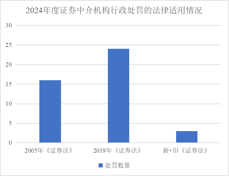 2024年的案例中,适用2005年《证券法》作出处罚的案例有16起,适用2019年《证券法》作出处罚的案例有24起,由于违法行为跨越新旧《证券法》而同时适用新旧《证券法》作出处罚的案例有3起。证券监管部门对于信息披露违法违规案件实行“一案双查”,但信息披露违法违规案件具有周期长、隐蔽性强、复杂性高的特点,因此近年来适用2019年《证券法》处罚的案件较少。然而,随着2019年《证券法》的实施,适用2005年《证券法》作出处罚的案例已逐步减少,2024年适用2019年《证券法》作出处罚的案件数量已超过适用2005年《证券法》作出处罚的案件数量,新法中大幅提高的业务收入罚没倍数与固定金额罚款幅度的威力已有明显体现,中介机构应高度重视。