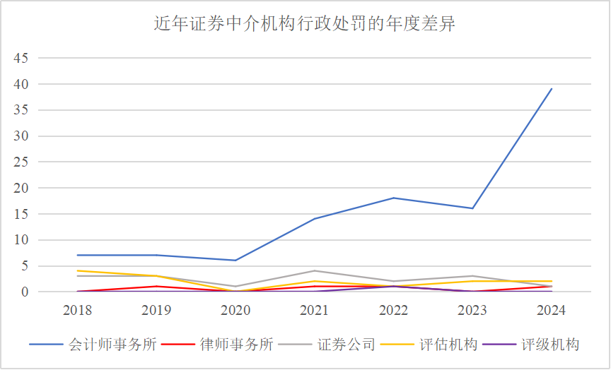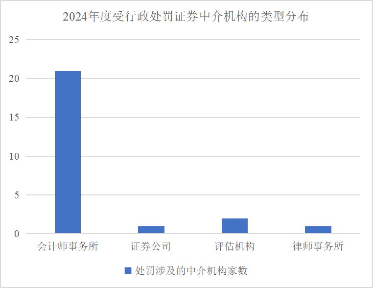 从上图可知,证券监管机构对中介机构的处罚集中在2021年~2024年。2018年~2020年,中介机构被作出行政处罚的总体数量都在15起以下,其中主要被行政处罚的中介机构为会计师事务所。2021年案件数量骤然增加,该年度共作出21起行政处罚;2024年案件数量增幅继续扩大,当年共作出43起行政处罚。