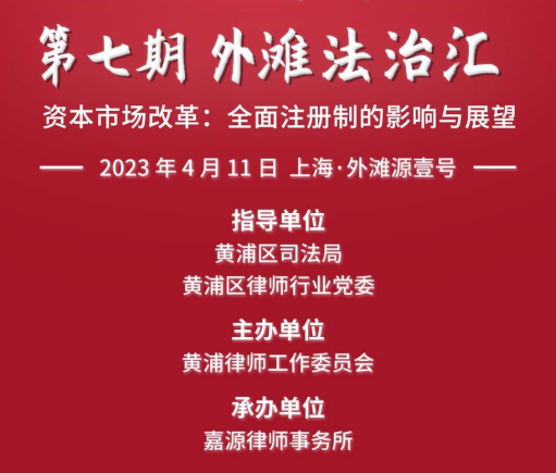 4月11日下午,由黄浦区司法局、黄浦区律师行业党委指导,黄浦律师工作委员会主办,北京市嘉源律师事务所上海分所承办的第七期“外滩法治汇”活动在外滩源壹号举行。黄浦区副区长林竞君,黄浦区司法局党委书记、局长王建忠,副局长王翔出席活动,来自黄浦区政府有关部门的领导、区内外律师事务所、企业的数十位嘉宾参加了本次活动。