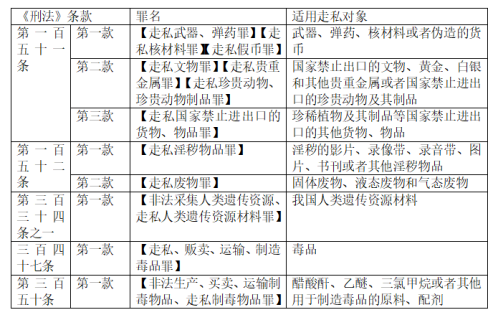 “走私罪”在《刑法》第三章“破坏社会主义市场经济罪”中的第二节。该节的走私罪名中,除了第一百五十三条走私普通货物、物品罪之外都列明了具体走私对象,《刑法》第三百三十四条之一非法采集人类遗传资源、走私人类遗传资源材料罪,第三百四十七条走私、贩卖、运输、制造毒品罪及第三百五十条非法生产、买卖、运输制毒物品、走私制毒物品罪也列明了具体走私对象。详见下表: