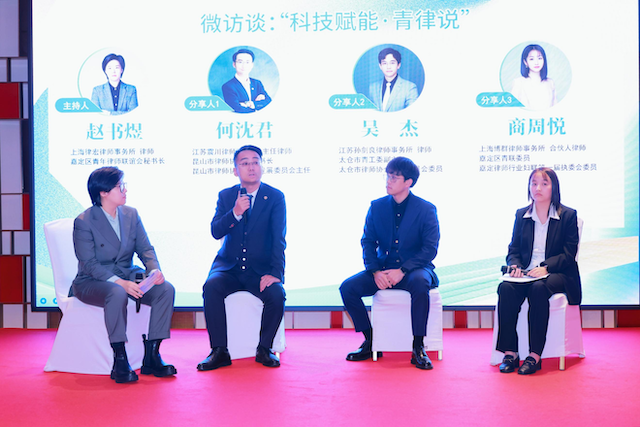 在随后的 “科技赋能·青律说” 微访谈中,来自上海、昆山、太仓三地的青年律师商周悦、何沈君、吴杰,在主持人赵书煜律师的引导下,展开了一场跨区域的思维碰撞。他们从 “AI工具如何提升文书效率” 的实操细节,聊到 “青年律师如何平衡科技学习与业务成长” 的现实困惑,再到对 “三地律所联动探索数字服务” 的无限憧憬,展现了新一代法律人的前沿思考与蓬勃活力。
