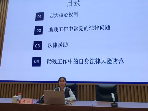 在授课中,周晓律师凭借专业功底与生动案例,将法律条文转化为易懂的工作方法,深入剖析残疾人康复教育、劳动就业、社会保障、无障碍环境四大核心权利的法律依据,针对基层工作中高频出现的监护人认定、民事诉讼程序、法律援助申请等问题逐一拆解,为基层工作者提供清晰处理路径。同时,她还特别强调助残工作者自身法律风险防范要点,助力学员精准规避履职风险,依法维护残疾人合法权益。既提升了助残工作者的法律素养与业务能力,更强化了他们依法助残、规范履职的责任意识。