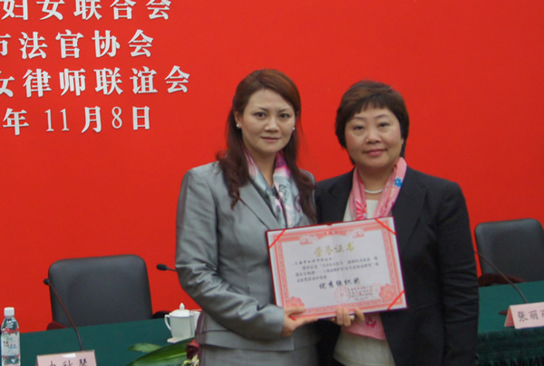 今年4月根据上海市妇联的要求,女律师联谊会通过网上动员、个别约稿、成立专项课题组等形式发动女律师参加关注妇女民生、保障妇女权益、促进社会和谐上海市维护妇女权益研讨征文,截止7月底,共收到30多篇论文,难能可贵的是上海沪家律师事务所的贾明军、付忠文、上海市嘉华律师事务所的王志远三名男律师也分别撰写了论文。收到论文后,女律师联谊会的会长、副会长及秘书长等反复就这些论文与作者进行观点的讨论及文字上的修改与斟酌。参选论文在评审中得到了较高的评价。最终在研讨会所设十个奖项中,女律师联谊会组织的论文有四篇获奖。其中,葛珊南律师撰写的“设立分居制度,保护妇女权益 ——浅谈我国婚姻立法中设立分居制度的意义与构想”、贾明军律师、蓝艳律师撰写的“离婚纠纷中女性股东权益保护研究”、卢湾区女律师联谊会撰写的“浅析离婚时未成年子女最佳利益保障” 等三篇论文获得二等奖。王彩萍律师撰写的“上海区域女职工劳动权益保障问题探讨”论文获三等奖。陆珊菁律师、韩璐律师撰写的“涉外婚姻中女性权益保障问题及对策”获优秀奖。女律师联谊会等四家单位获得优秀组织奖。