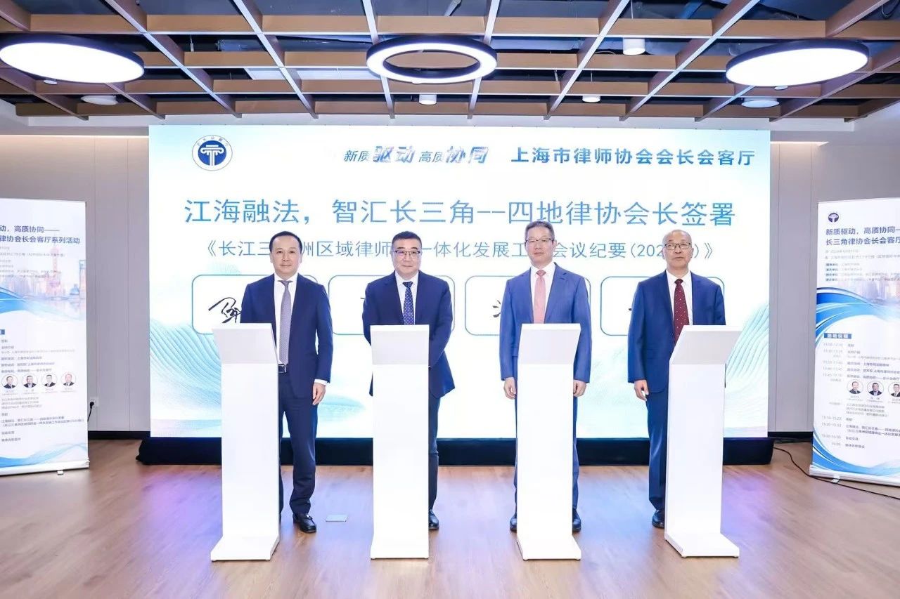 会上,四地律协会长共同签署了《长江三角洲区域律师业一体化发展工作会议纪要(2024版)》。该纪要涵盖了常态化沟通机制建设、培训研讨资源共享、宣传媒介平台协同、文化建设交流、青年律师培养和女律师工作联动等12项工作,为沪苏浙皖四地律协后续深化一体化高质量发展列出了“任务清单”。