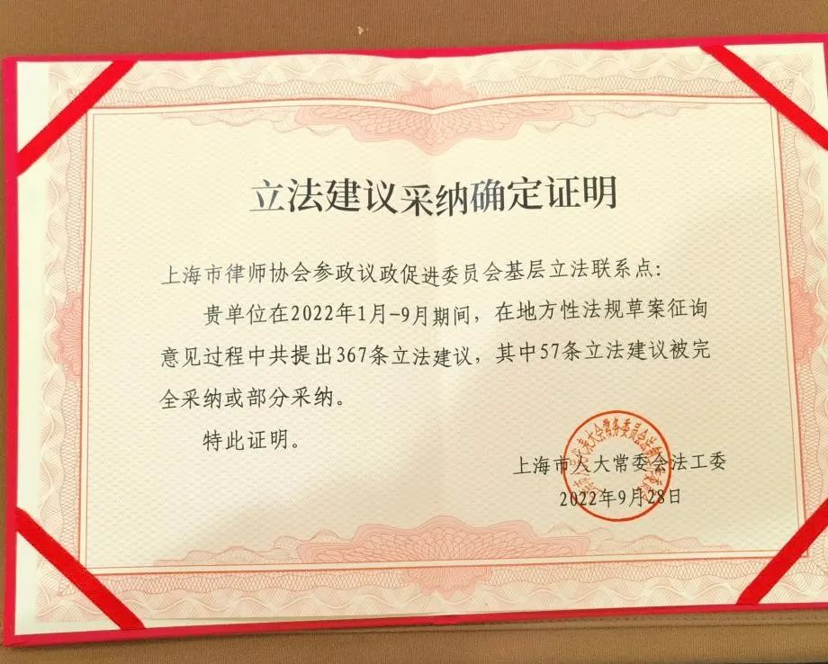 上海市律师协会自2016年被市人大常委会确定为首批基层立法联系点以来,充分发挥法治智库作用,将基层立法联系点作为上海律师参政议政、履行社会责任、践行全过程人民民主的重要平台。2022年1月至9月期间,在地方性法规草案征询意见过程中,上海市律师协会共提出367条立法建议,其中57条立法建议被完全采纳或部分采纳,立法建议数和采纳数都位居基层立法联系点前列。