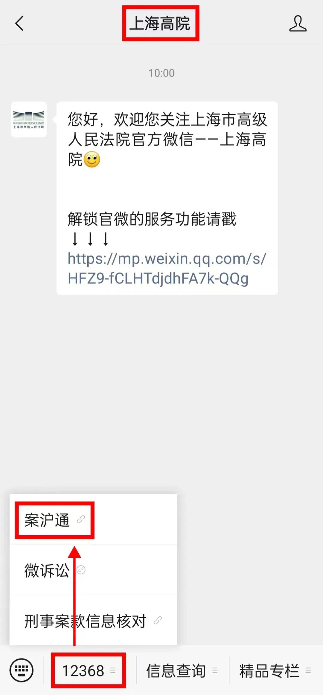 在微信中搜索并关注“上海高院”微信公众号,点击左下角“12368”栏目,即可找到“案沪通”选项。