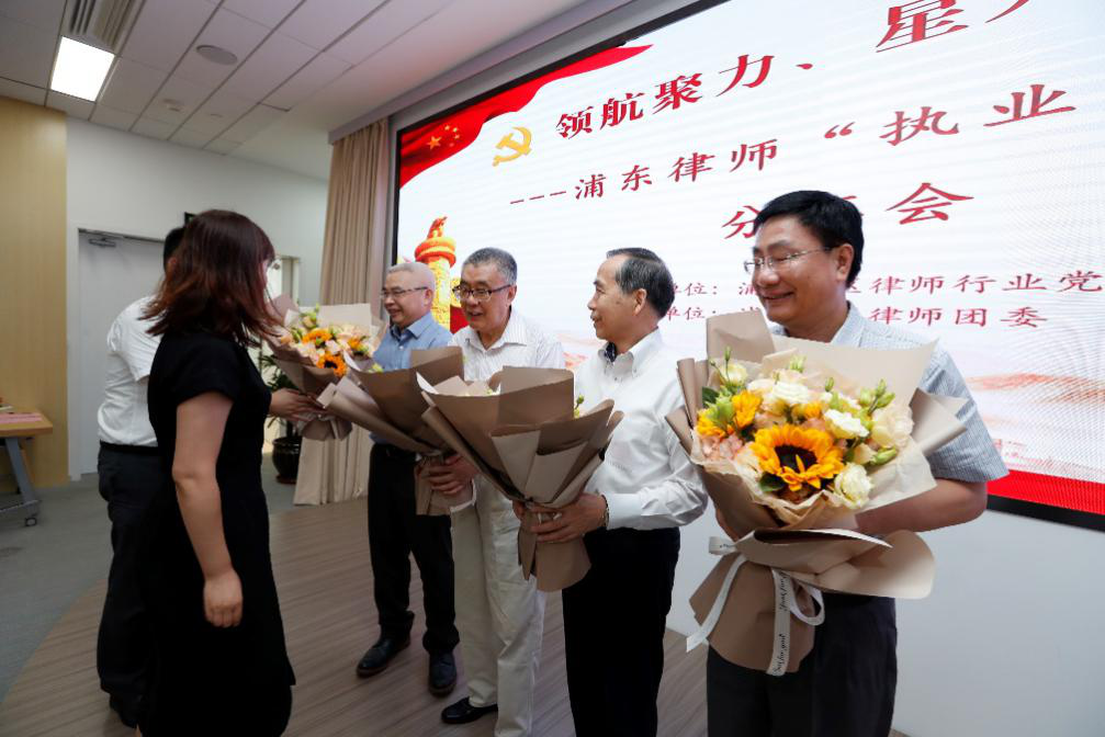 本次会议还邀请了北京金诚同达(上海)律师事务所律师丁邦开、上海融孚律师事务所律师张金成、上海市瑛明律师事务所律师江浩雄、上海市凯荣律师事务所律师金玉来四位执业30年以上的律师。四位嘉宾律师是业界的前辈,更是专业上的大咖,为了体现党员律师“传帮带”的优良品质,奋战在律师岗位上的老前辈,在百忙之中抽出时间向青年律师分享自己的执业故事,上海市浦东律师团委书记韩璐代表青年律师向他们致敬,青年团员代表也早早准备了姹紫嫣红的鲜花,敬献给四位最可爱的人。