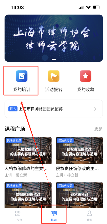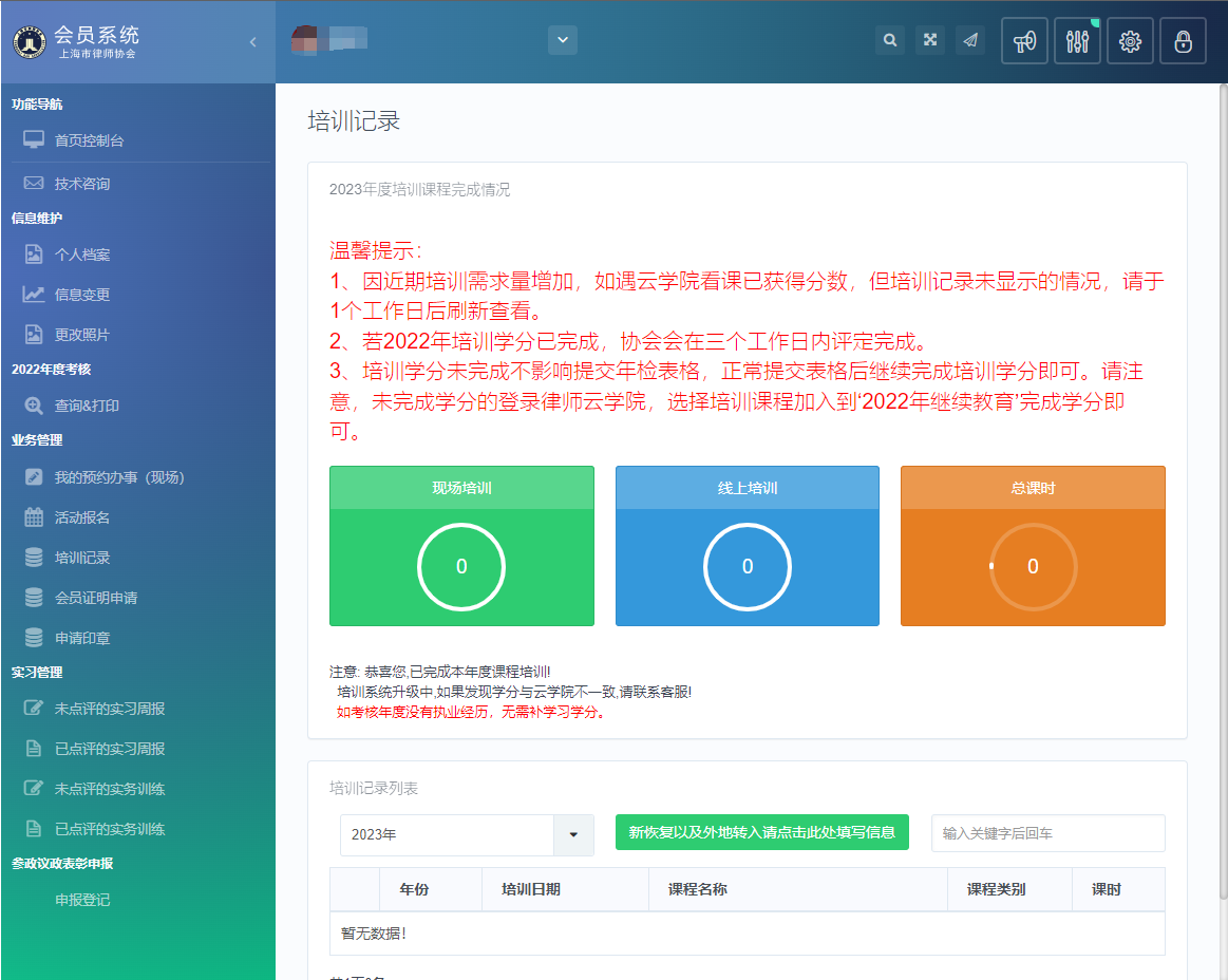 网络培训通过登录律师云学院完成:选择2023年度网络培训课程,即可学习2023考核年度的培训课程。