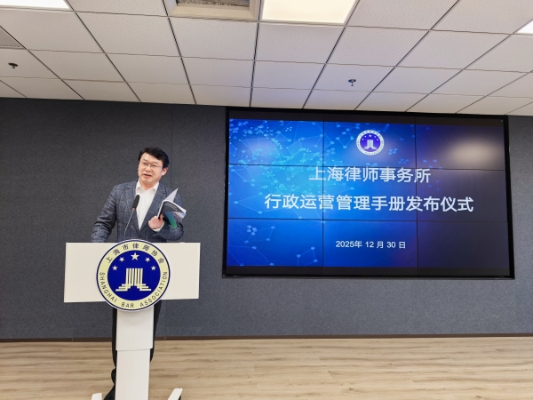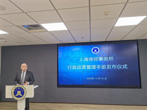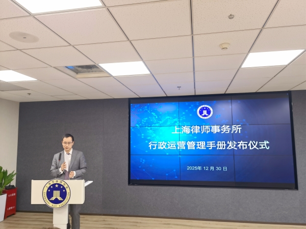 2025年12月30日下午,《上海律师事务所行政运营管理手册》发布仪式在上海律协20楼报告厅举行。上海律协秘书长唐洁,理事、律所规范与发展委员会主任王军旗,律所规范与发展委员会副主任周晶敏出席仪式。手册编写组成员以及50余位本市律所行政运营主管共同参加了发布活动。